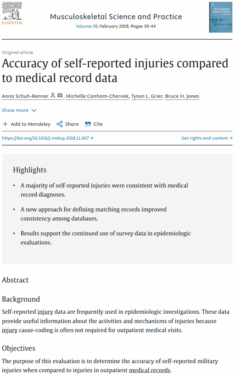 Developed in collaboration with leading injury epidemiologists and injury research centers, FITSTATS injury surveillance system incorporates a military-specific version of the scientifically validated he OSTRC-H questionnaire. It helps military medicine researchers capture the full burden of injuries, and develop preventive strategies with the most accurate methods and tools.